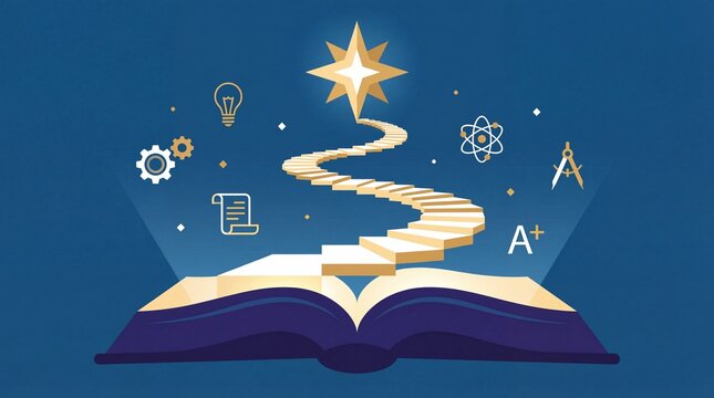 Stunning educational illustration of a staircase rising from an open book to a shining star