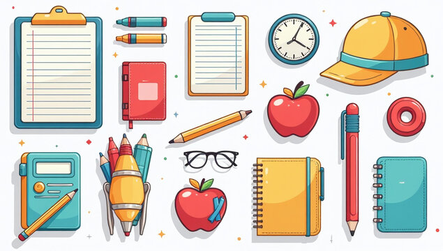 cartoon illustrations school supplies accessories cute designs modern styles various educational needs purposes