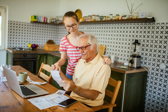 Father, son and help with bills in home for finance paperwork, advice or mortgage application with senior. Budget document, men or discussion for loan, debt or teaching investment with African family