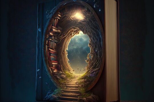 Book with a portal and a tree on the background of clouds. Fantasy, symbolism, self-development, education, fairy tales, high resolution, art, generative artificial intelligence