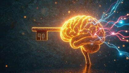 Illustration of golden key unlocking brain. The artwork symbolizes innovation. Digital art conveys ideas about potential and creative thoughts. It represents the power of imagination and solutions.