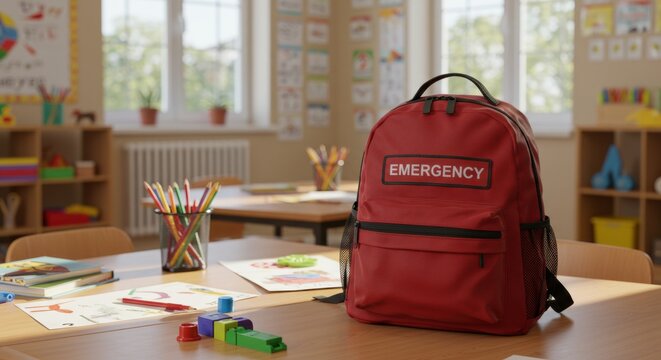 Red emergency backpack in classroom setting for safety preparedness in schools