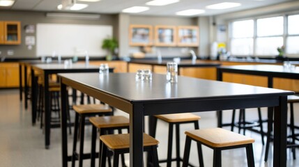 Modern classroom with long black tables and wooden stools natural bright lighting.