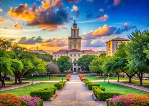Sunset over cityscape with silhouetted skyscrapers and flying bats against a purple-orange sky, vector art style background