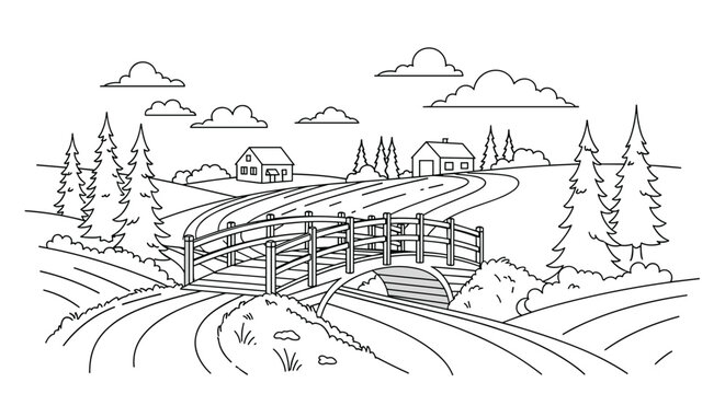 Drawing of an arched bridge over a river landscape for coloring and educational bridge illustration project