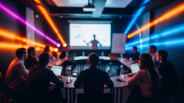 Attendees listen attentively to a speaker leading a corporate training session in a bright, modern office space filled with large windows and engaging visuals.