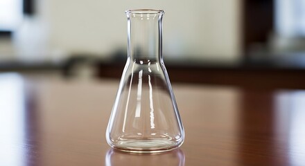 Crystal clear erlenmeyer flask on a polished surface revealing laboratory sophistication and detail revealing light