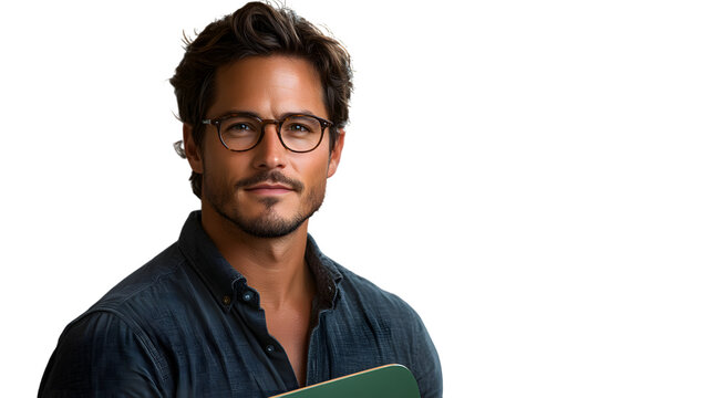 A man with glasses holding a book exuding intelligence and sophistication for educational or p