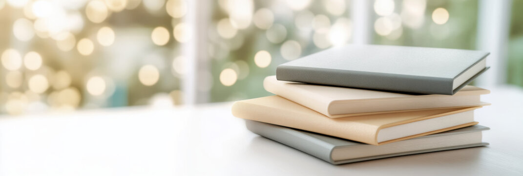 A neatly arranged stack of hardcover books showcases elegant tones of beige, gray, and off-white. This minimalist display on a flawless white surface adds sophistication to any decor.