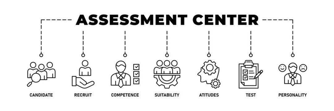 Assessment center banner web icon vector illustration concept for personal audit of human resources with icon of user candidate, recruit, competence, suitability, aptitudes, test and personality