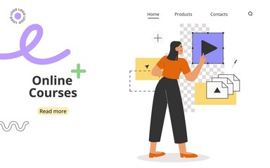 Concept of online courses or education. Modern flat vector illustration with inspired woman working in a graphics program for illustrators, designers or photographers.