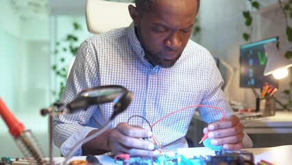 Close-up portrait of young bearded African technician checking resistance of motherboard with multimeter working in service. Focused professional man fixing components of computer in office.