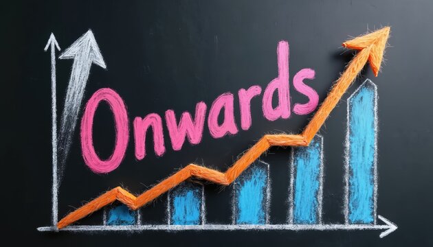 Chalk drawing shows upward trend graph with word Onwards. Bars indicate rising data. Arrow points up indicating success. Business chart signifies progress.