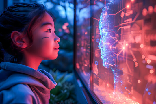 A young child enchanted by a sparkling AI hologram display, showcasing the wonder of future tech.