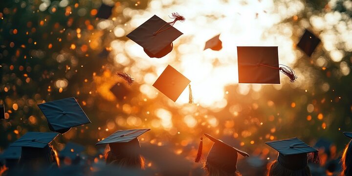 Graduates throwing black mortarboard caps into the air at sunset during an outdoor graduation ceremony symbolizing celebration and achievement