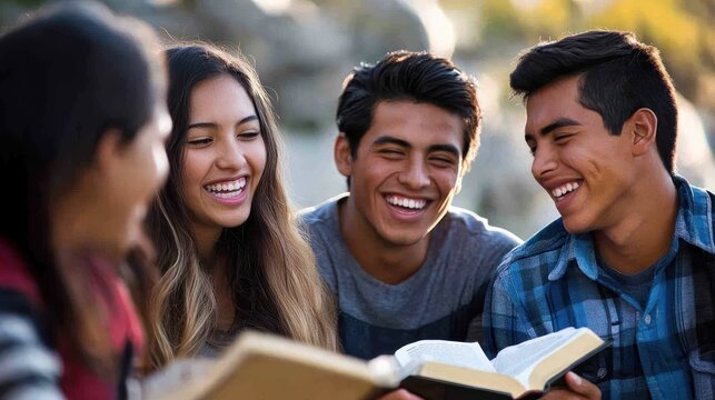 Happy teens reading Bible outdoors, nature background, youth group