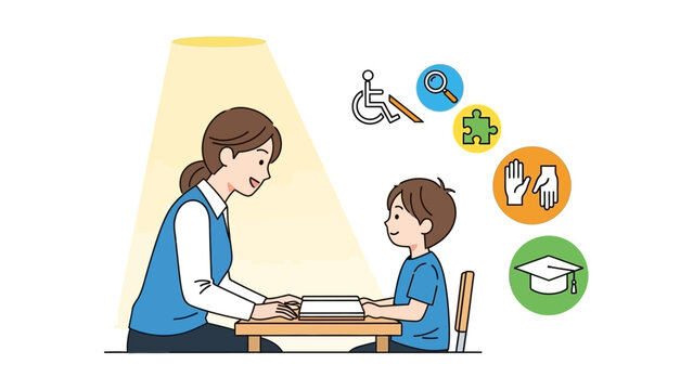 Illustration of a teacher providing educational support to a student with learning difficulties, promoting inclusivity and personalized learning