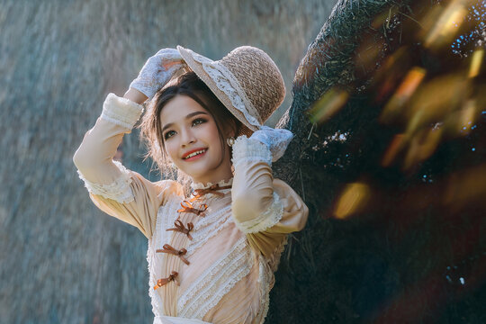 Young Asian woman in edwardian style dress and big hat standing in the front of the hut. Portrait of aristocratic girl.vintage blouse costume. Historical dresses, victorian or edwardian