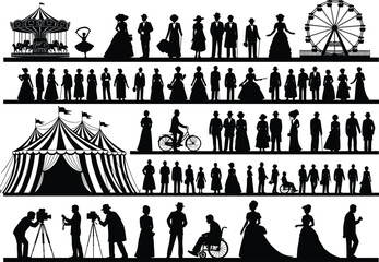 Vintage silhouette collection of Victorian and Edwardian people, circus tent, carnival carousel, and Ferris wheel. Isolated vector set with crowd, photographers, and bicycle.