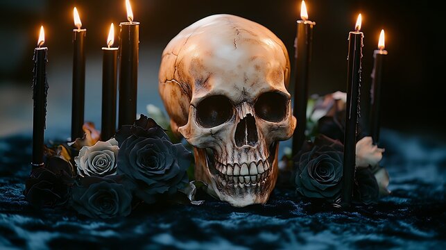 Spooky Halloween ambiance with burning black candles and eerie skull decorations for dark aesthetics
