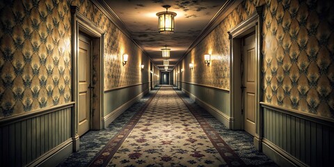 Spooky exploration of eerie hotel hallway with flickering lights and peeling wallpaper