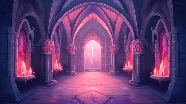 cartoon illustration Long medieval castle corridor with torches. Interior of ancient Palace with stone arch.