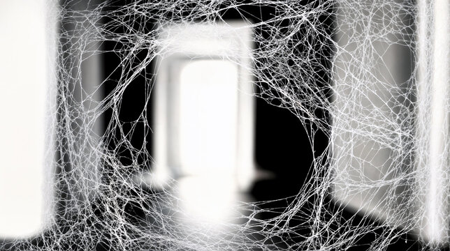 spider webs in eerie corridor with blurred doorway texture for design with copy space