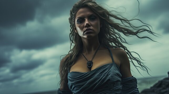 Model as a mermaid witch, near a stormy sea, with dark clouds gathering