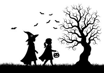 Halloween silhouette kids trick or treating with spooky tree and bats