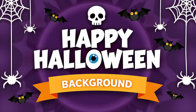 Happy halloween text with spooky bats spiders and a skull on purple background
