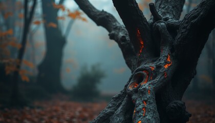 Lone dead tree covered in glowing lichen, its branches stretching like veins