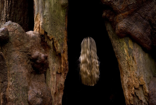 A woman with long, blond hair stands in the old growth redwood forest, her body blacked out by the darkness between the trees so it looks like a floating head; California, United States of America