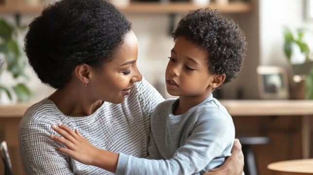 A parent comforting a child and discussing ways to handle frustration, teaching effective emotion management