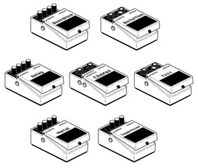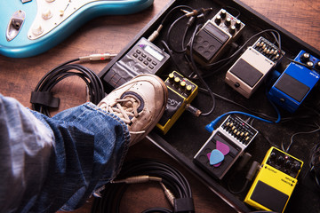 Stepping on a electric guitar audio processing effects on a studio or stage floor. Electric guitar and stomp box type effectors and cables on studio floor. Intentionally shot with low key tone.
