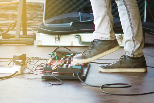 Musician tuning guitar effect pedal for best music during concert on stage. Guitarist tapping on it for different sounds. Macro view.