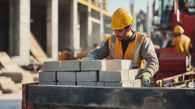 Laborer transporting materials on a construction cart at a building site. Featuring efficiency and teamwork