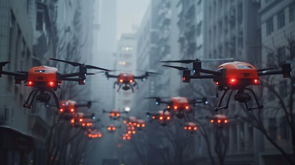 Drone delivery service headquarters, fleet management: The headquarters of a drone delivery service hums with activity as a team manages the fleet, coordinating efficient and timely deliveries