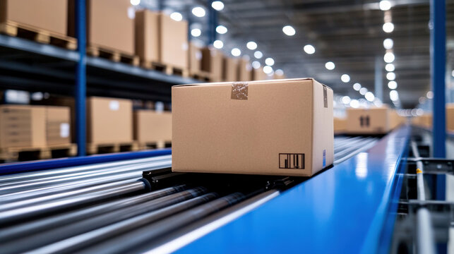 Close-up view of cartons on a conveyor belt in a production line, showcasing package handling at a busy warehouse setting