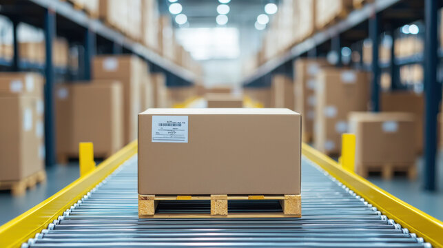 Close-up view of cartons on a conveyor belt in a production line, showcasing package handling at a busy warehouse setting