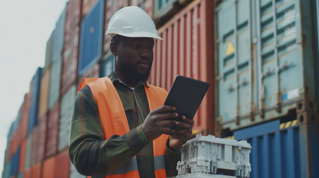A cargo airport worker uses a tablet to check shipment details, coordinating with warehouse staff for efficient handling.