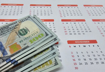 Cash arranged on calendars showing the dates of each month in 2026 and highlighting financial concept