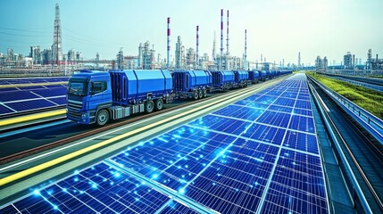 A futuristic city with interconnected battery storage systems and solar panels, highlighting the concept of sustainable battery supply and efficient energy management in an eco-friendly urban