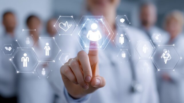 Healthcare professional collaborating on a digital health record interface clear foreground with blurred coworkers symbolizing teamwork and digital integration in medical fields.