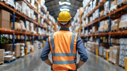smiling worker in orange vest stands confidently in a warehouse, man working by organized shelves, efficient inventory management and teamwork concept