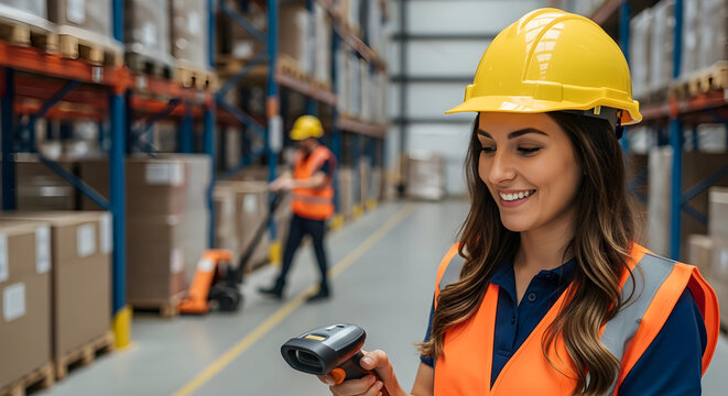 Smiling female warehouse worker using barcode scanner efficient logistics distribution center teamwork inventory management supply chain technology