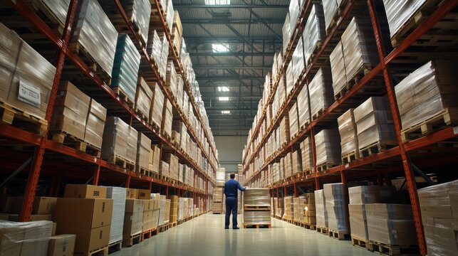 A worker in a modern warehouse aisle, focused and efficient in a dynamic logistics environment