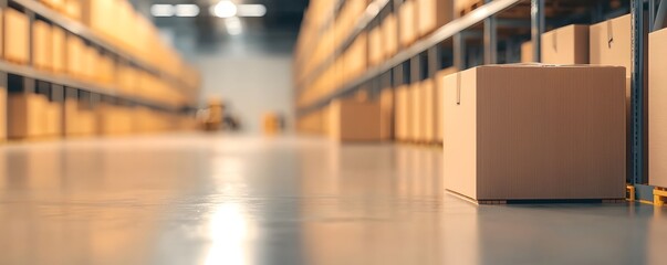 Expansive warehouse interior showcasing neatly stacked boxes on shelves and pallets. Bright lighting highlights the organized space, indicating efficient storage solutions