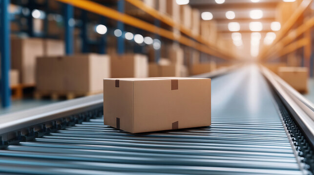 A high-tech conveyor belt transports boxes in a warehouse setting, showcasing modern logistics and efficient package handling.