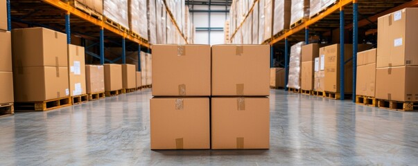 A well-organized warehouse aisle lined with neatly stacked cardboard boxes, showcasing an efficient storage system in a modern logistics facility.