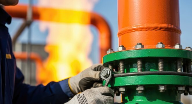 Industrial worker repairing natural gas pipeline with wrench and flame in background. Natural gas pipeline needs constant maintenance to ensure safe and efficient distribution.